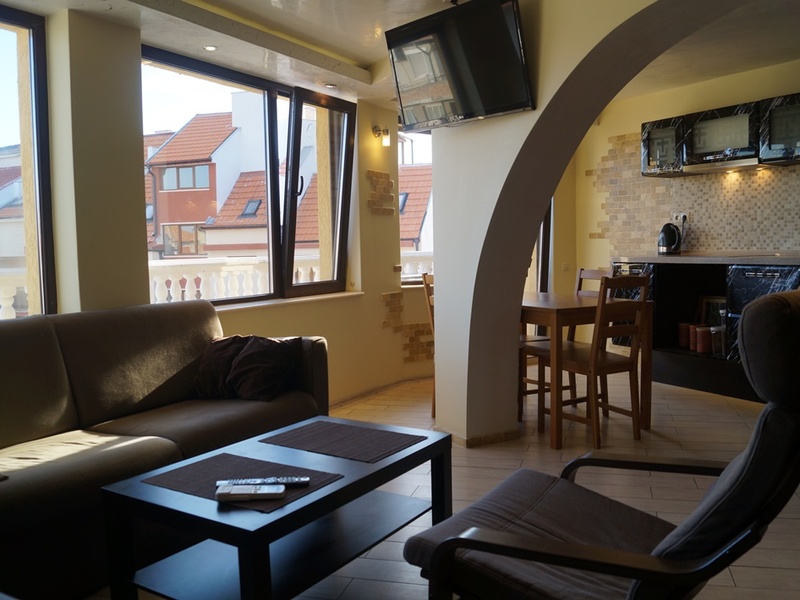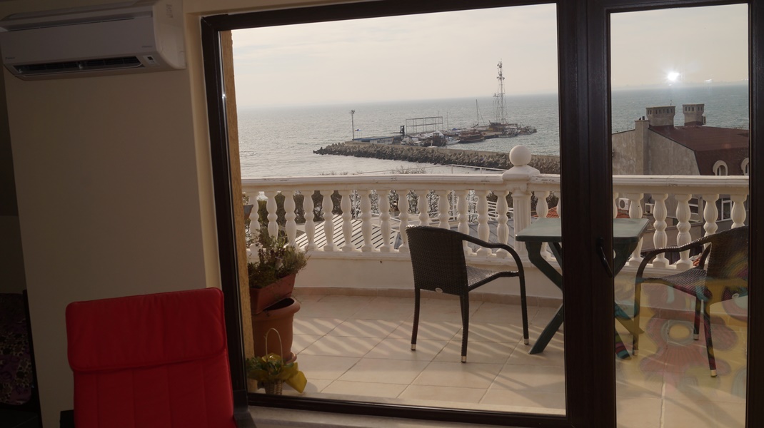 Two bedroom apartment is located in the town of Pomorie on the second sea line - only 100 m from the sea. The duplex apartment has a wonderful panoramic sea view! The apartment is located on the 4 and 5 floors and consists of: First level - living room with kitchenette, terrace with sea panorama Second level - two bedrooms, bathroom, storage room and big terrace The apartment comes fully furnished.