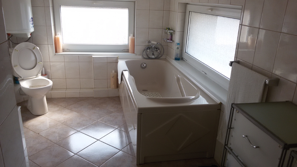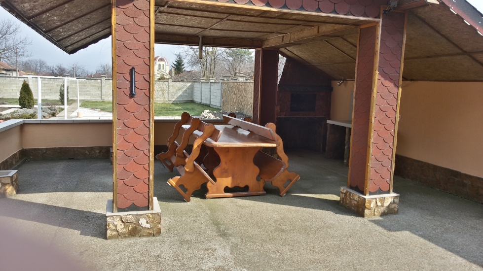 Ground floor – entrance corridor with a double opening UPVC window framed front door, a large and spacious living room, a dining room, a wide and fully fitted kitchen, a laundry room with a sink, a washing machine and units. There is a second corridor, connecting the kitchen and the dining room, a room with a furnace heating system, operating with coal and or wood and connected to 13 radiators, a rear patio exit door, leading to an outside barbeque area.