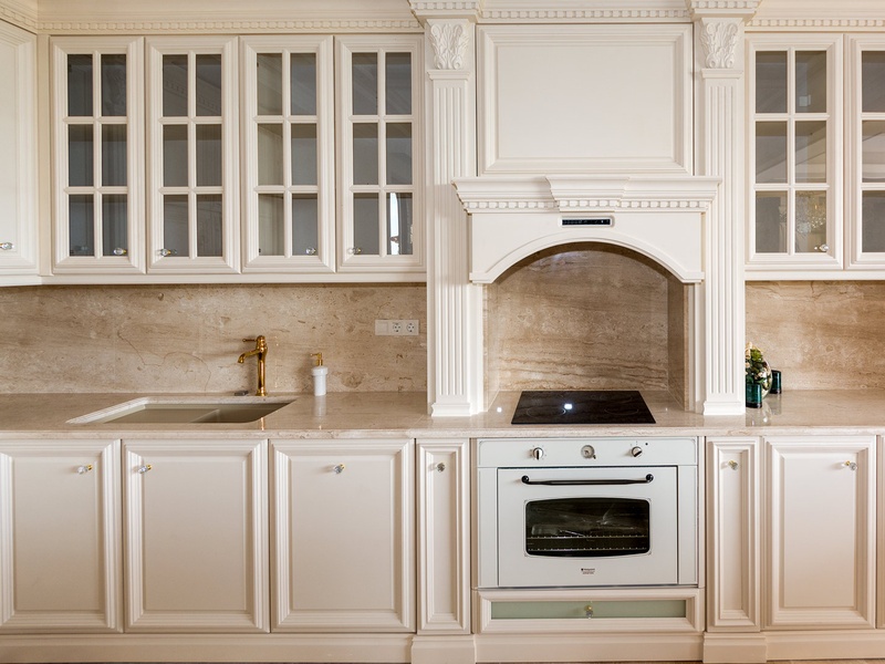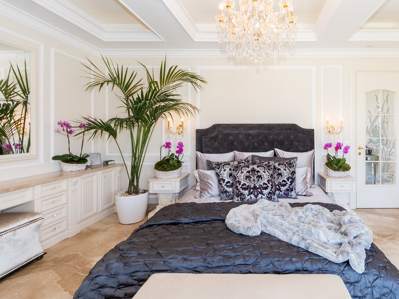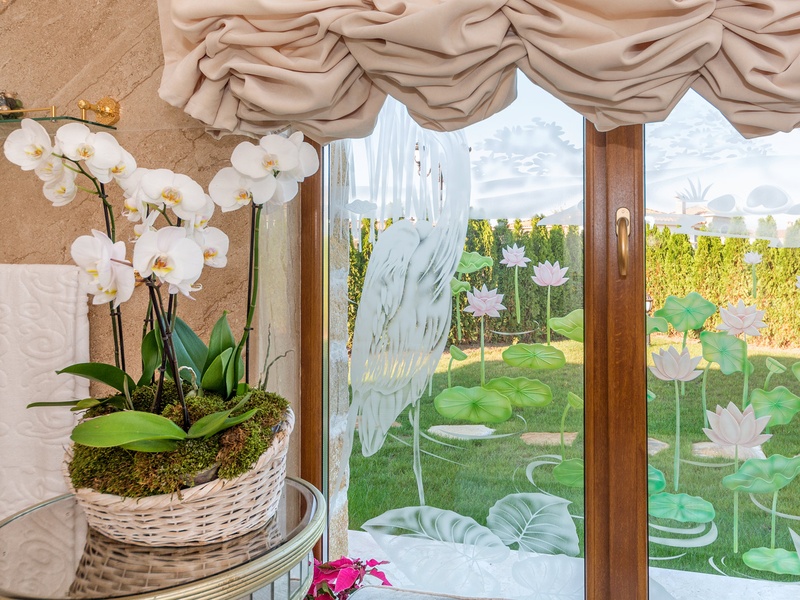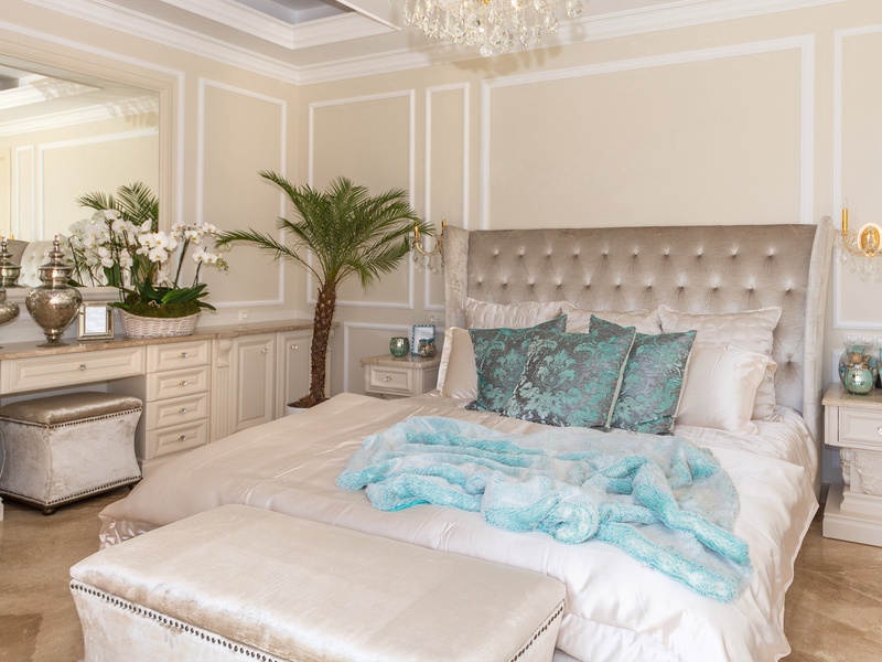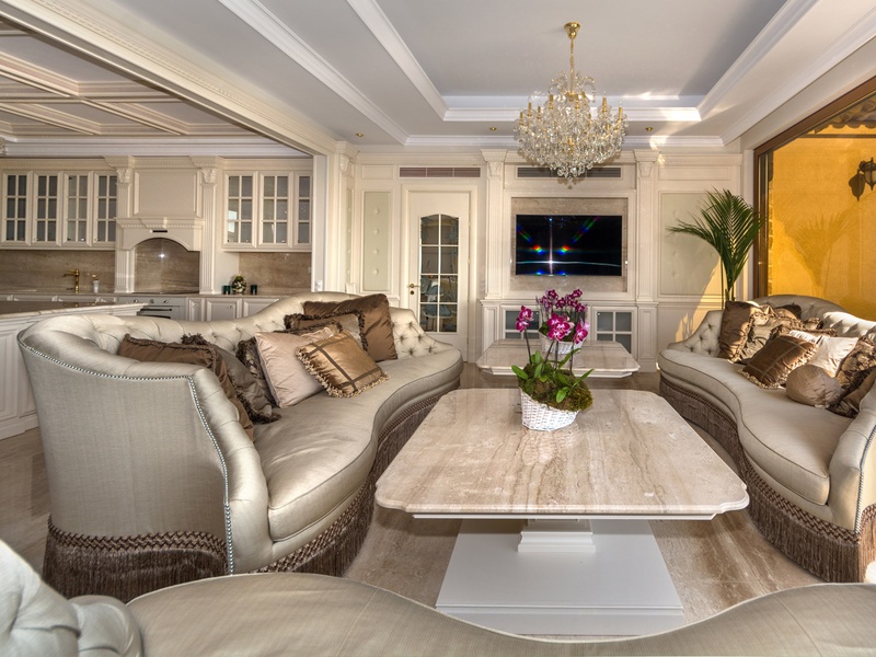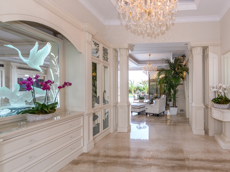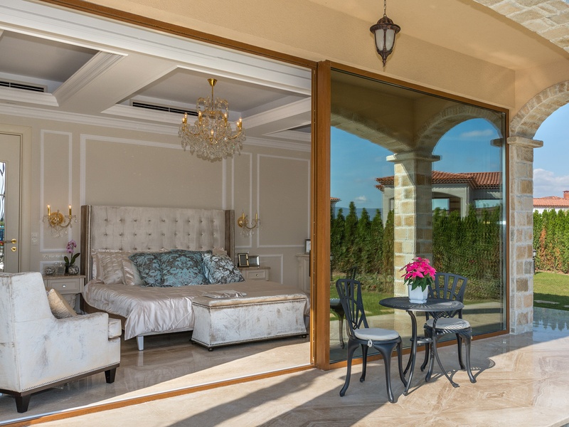 Through the impressive entrance you get into a spacious living room. The living space and the kitchen are in an open space ensemble. There is a large dining room with a table for ten and a kitchen. The living room has areas for relaxation and areas to have fun, and a large fireplace. East of the living room is a veranda to which one gets through large windows that can be opened up to form a big passageway, ideal for late night parties. There are three double bedrooms with en suite bathrooms and walk-in closets. The living room and two of the bedrooms overlook the backyard garden and the pool. The large swimming pool tiled with natural marble (Daino) lies in the centre of the garden. The garden itself is large and leafy, planted profusely with exotic trees and flowers, with space for deckchairs around the pool. The furnishings of the house are luxurious and very elegant, with custom-made furniture. The interior is made up of fine natural materials, natural marble Daino, and wood.