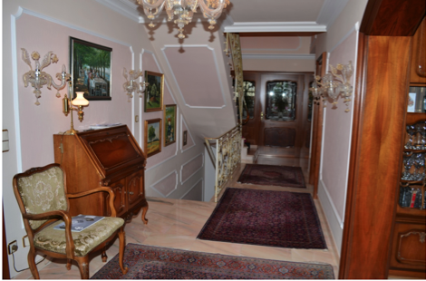 Респектабельный вход, на первом этаже большая прихожая, кухня, столовая, гостиная с импозантным камином из мрамора, мебель кухни в баварском стиле, гостевая комната с ванной комнатой, гостевой туалет. Мраморные полы. Респектабельная лестница на второй этаж. Литье, мрамор.