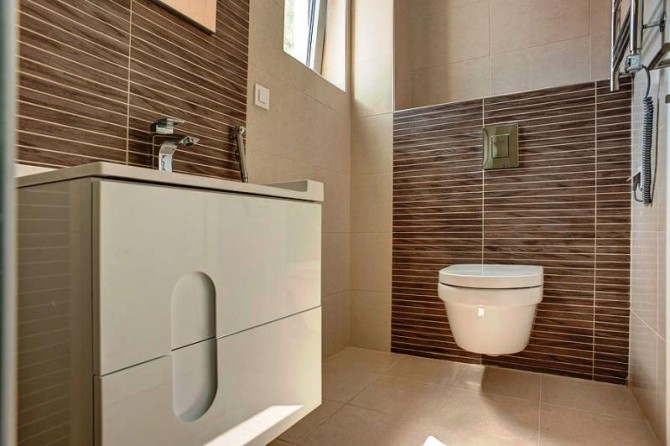 On the third floor there is one room which has a front-facing balcony, a bathroom, and a corridor leading to rear-facing terrace which has a modern, stylish awning. Behind the terrace is a patio and green space, from which there is a wonderful view of the mountain range, the bay and the surrounding tiled rooftops.