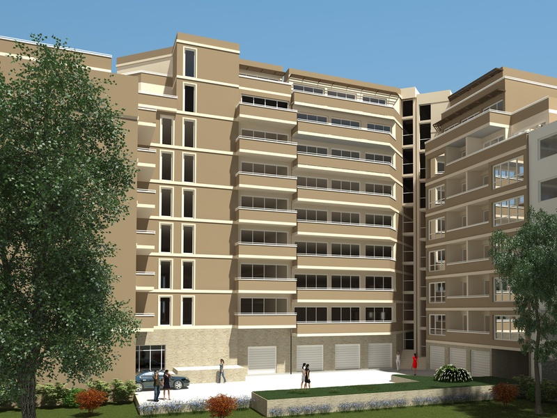 Здание имеет подвал, цокольный этаж и восемь этажей в трех отдельных входов с лифтами. Подвале и на первом этаже будут и гаражи и два магазина на первом этаже. В апартаментах есть одна или две спальни и студий.