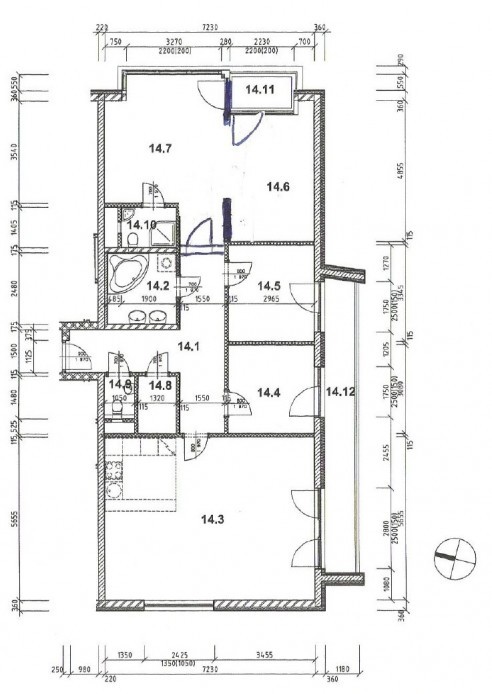 Интерьер квартиры составляет угловая гостиная с кухней, 3 спальни, 2 ванные комнаты (одна из них примыкающая к главной спальне), отдельный туалет, кладовая и центральный холл. Гостиная и две спальни имеют выход на террасу, последняя комната имеет собственную лоджию. Планировка квартиры была первоначально задумана как 5 + кухня-ниша, разделением самой большой спальни можно снова этого достичь.