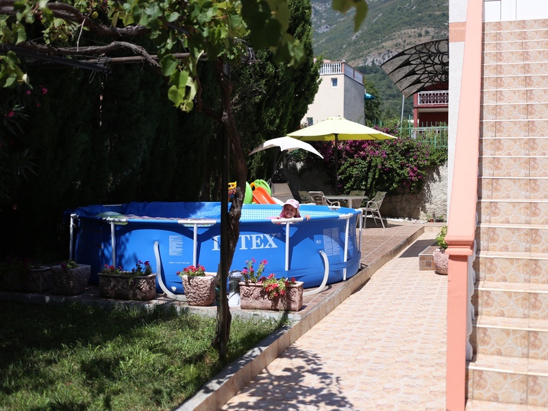 садом ,виноград и плодовые деревья, груши, черешня, хурма . Дворовая территория ухожена и оснащена современной системой полива . У дома есть площадка с зоной для отдыха , парковка для 2 машин . Вода централизованная, отличного качества, горячая от системы солнечного обогрева , система современная . Есть где поставить бассейн в том числе стационарный. Дом хорошо сдается в сезон с июня по октябрь. Рядом , 5 минут ходьбы супермаркеты, аптеки, кафе , рестораны . Дом находится ниже главной дороги, поэтому шума от машин нет, воздух чистый. Вообще тихое и прекрасное место . До города Бар на авто или автобусе 10 минут , до аэропорта Тиват или Подгорица 40 минут . Соседи доброжелательные . Идеален для семей с детьми .
