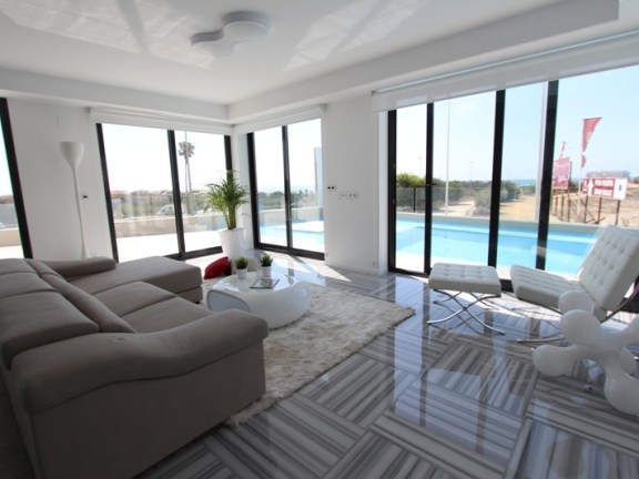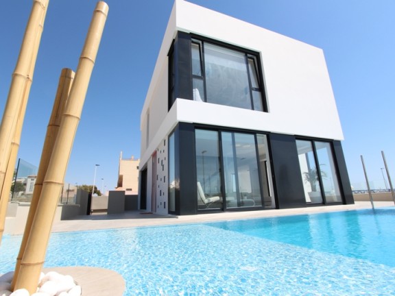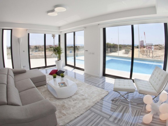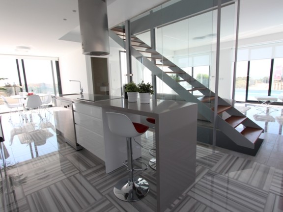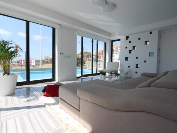 Sale Modern and luxury villa with sea views in Costa Blanca (south), a strip of the Mediterranean coast of Spain, Alicante province, autonomous community of Valencia. Zone of tourism and recreation. The villa was built in 2015, it has 5 bedrooms, 3 bathrooms. The living area of the villa is 295 square meters, the total area of 305 square meters plot of 700 square meters, parking. The villa has a private terrace, mountain views, air conditioning, swimming pool, cellar, garden, sea views, kitchen. The villa is famous for its luxury contemporary design, which is dominated by large windows that allow sunlight to penetrate. Paco Fuster, an architect, designed the house with great attention to detail. Architecture and interior design offers an excellent example of how you can combine the elegant facade with a cozy interior. It consists of a large living room with a fully equipped stainless appliances, 3 bedrooms and 3 bathrooms, kitchen. The house is divided into 2 floors, plus an English garden and a garage. Good distribution of the windows to establish a strong connection with nature and at the same time allows its residents to enjoy a beautiful view of the sea.