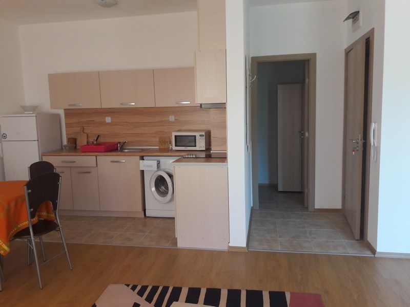 Spacious studio for sale in peaceful town Byala, region Vrana on the Bulgarian Black sea coast. The building situated between beach /400 meters/ and center of the town. Studio on the 2 floor equipment with kitchen with crokery, refrigerator, ceramic hotplace, microwave, laundry. Extensible sofa for 2 persons and single bed, balcony. Conditioner in the room. Celer with wardrobe in little corridor and