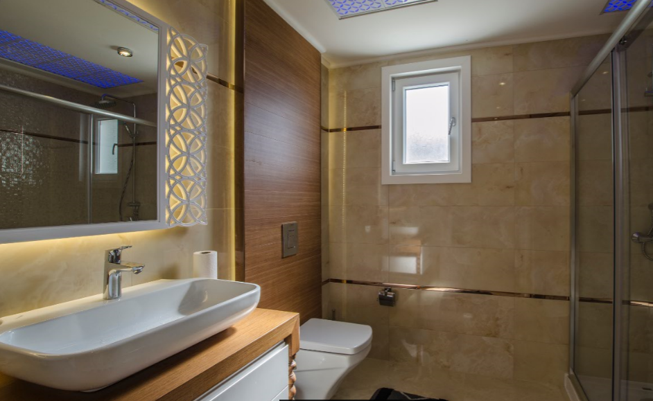 •	В ванных комнатах полный комплект сантехники, встроенная мебель и настенное зеркало