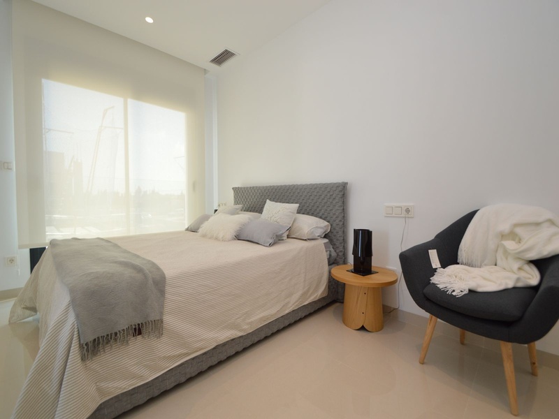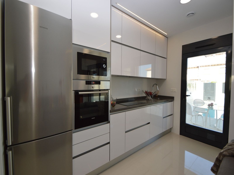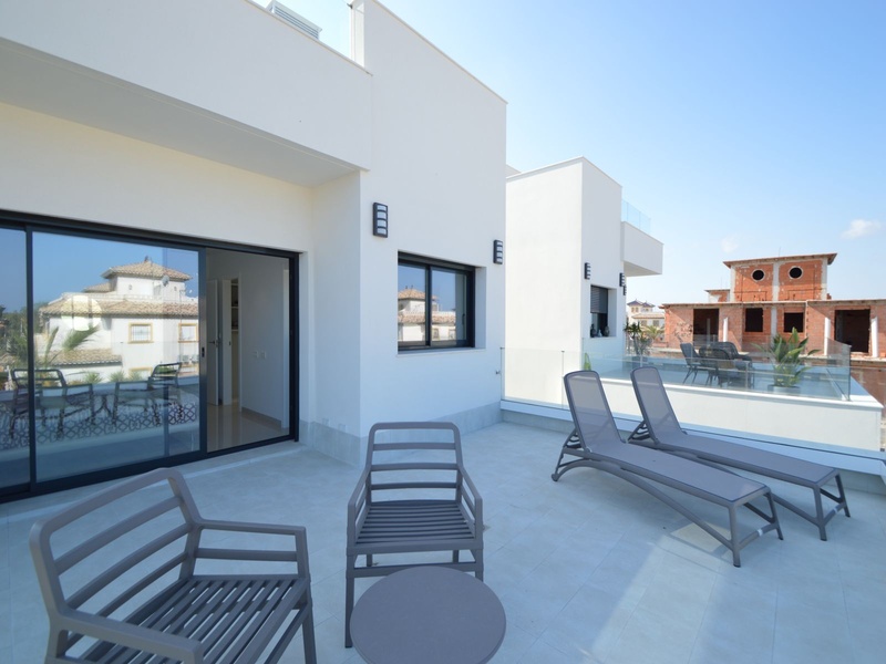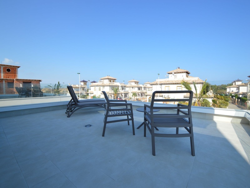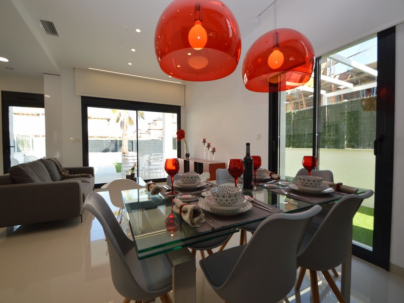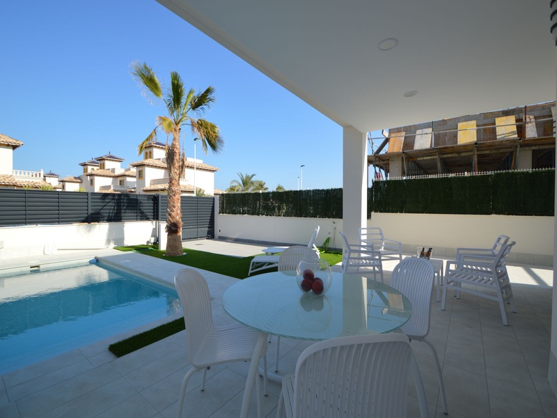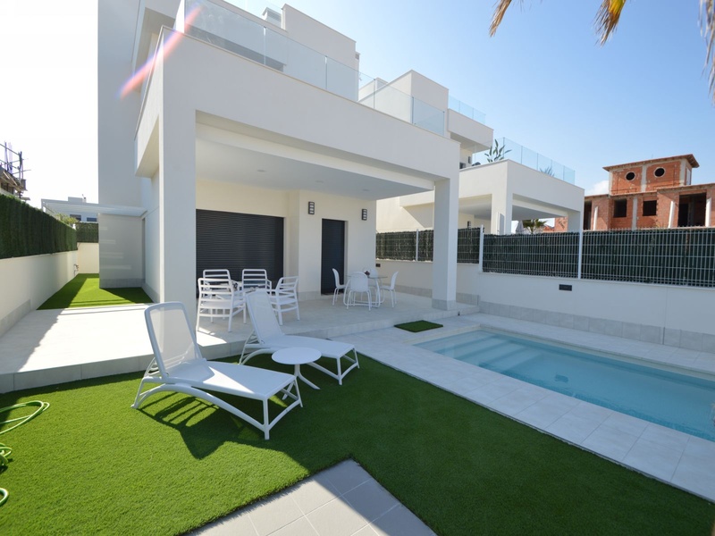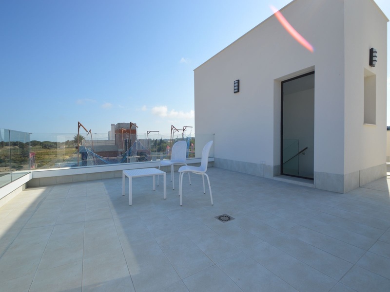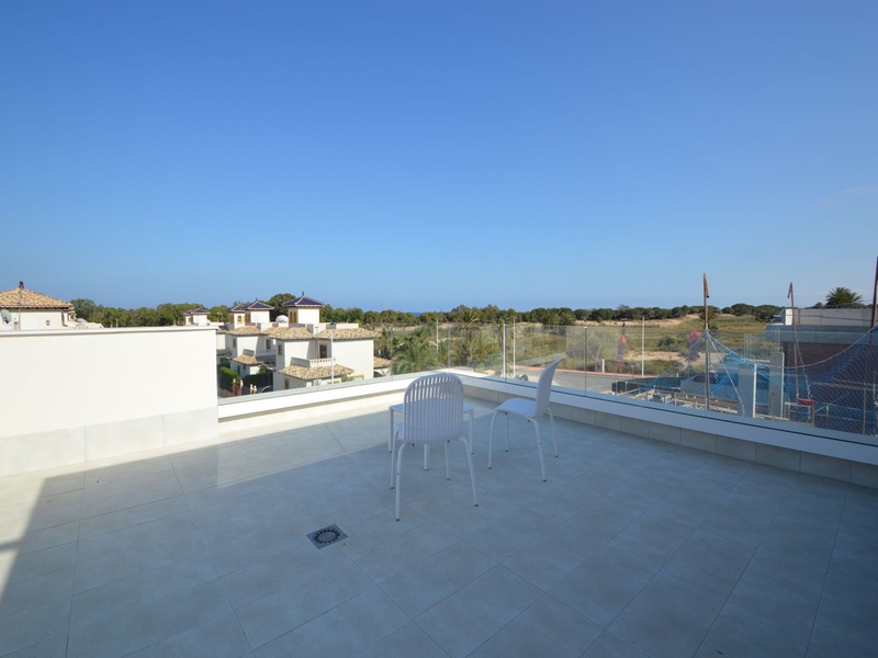 A private modern house. New build property, high quality construction and finishing materials. Energy Efficiency class B. The villa has a built surface area of 163.35 square meters, distributed between two floors. It has a large porch, a living room, a kitchen, 1 bathroom, a laundry room, a storeroom and 1 spacious bedroom with a private dressing room on the ground floor, and two large bedrooms with private dressing rooms and bathrooms on the first floor, plus the master bedroom has a large terrace with a surface area of 31.96 square meters. The house also disposes of a solarium with a surface area of 49.70 square meters. It is located on a plot with surface area of 348.26 square meters, covered with a garden, with a private pool and a parking space for one car. Thermalt and acoustic insulation, waterproof walls on the out side, armored entrance door, motorized blinds with independent ventilation, aluminium double glazed windows, fully furnished and equipped kitchen, bathrooms and laundry are also fully equipped, air conditioning with an individual machine for each floor, solar water heater, pre-installation of acclimatization of the pool, automatic irrigation system. 350 meters from the beaches of La Marina and El Pinet, consisting of soft golden sand that stretch for almost 3 kilometers along a strip of impressive natural dunes, next to a large pine forest and the Salinas del Pinet. These beaches dispose of blue flags, coastguards, restaurants by the edge of the sea, and a sports station that offers a variaty of water activities. The area has all the amenities possible, it is located 13 kilometers from Elche, 20 kilometers from Torrevieja and 25 kilometers from Alicante.