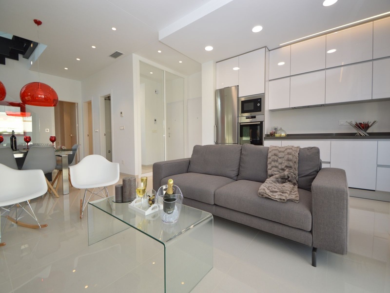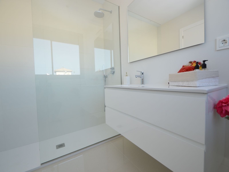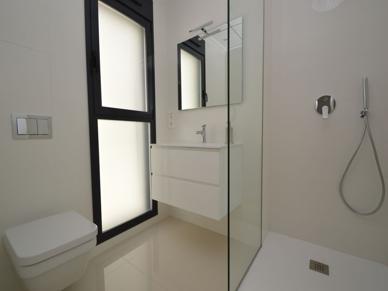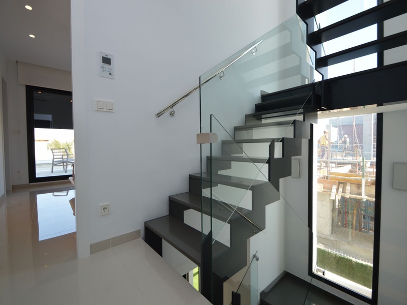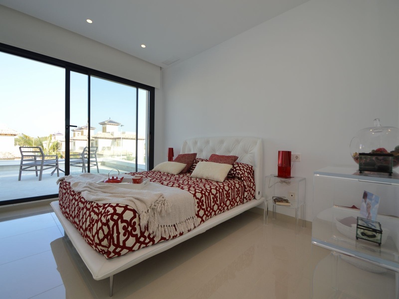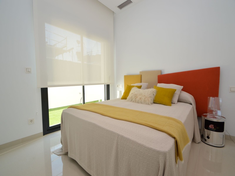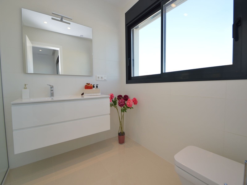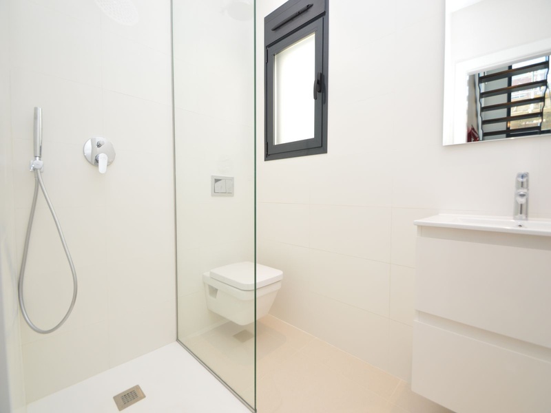 A private modern house. New build property, high quality construction and finishing materials. Energy Efficiency class B. The villa has a built surface area of 163.35 square meters, distributed between two floors. It has a large porch, a living room, a kitchen, 1 bathroom, a laundry room, a storeroom and 1 spacious bedroom with a private dressing room on the ground floor, and two large bedrooms with private dressing rooms and bathrooms on the first floor, plus the master bedroom has a large terrace with a surface area of 31.96 square meters. The house also disposes of a solarium with a surface area of 49.70 square meters. It is located on a plot with surface area of 348.26 square meters, covered with a garden, with a private pool and a parking space for one car. Thermalt and acoustic insulation, waterproof walls on the out side, armored entrance door, motorized blinds with independent ventilation, aluminium double glazed windows, fully furnished and equipped kitchen, bathrooms and laundry are also fully equipped, air conditioning with an individual machine for each floor, solar water heater, pre-installation of acclimatization of the pool, automatic irrigation system. 350 meters from the beaches of La Marina and El Pinet, consisting of soft golden sand that stretch for almost 3 kilometers along a strip of impressive natural dunes, next to a large pine forest and the Salinas del Pinet. These beaches dispose of blue flags, coastguards, restaurants by the edge of the sea, and a sports station that offers a variaty of water activities. The area has all the amenities possible, it is located 13 kilometers from Elche, 20 kilometers from Torrevieja and 25 kilometers from Alicante.