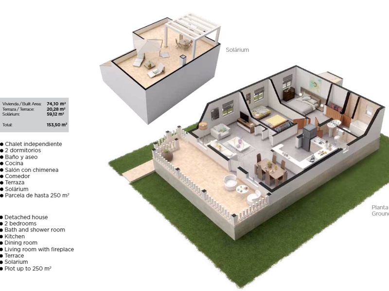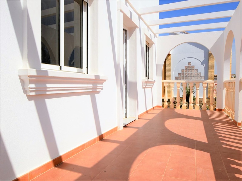 Detached new build house with classic design. Located on a plot of 165,82 square meters of a surface with private gardens. It consists of 65,70 square meters of a built surface area, divided between 2 bedrooms, 2 bathrooms (1 of which is a suite bathroom), separate kitchen, a very large living-dining room. It has a solarium of a built surface area of 51,45 square meters and a terrace of 20,28 square meters of a built surface area. The bedrooms have built-in wardrobes, bathrooms and kitchen fully equipped, pre-installation of air conditioning and solar energy. The villa is situated in a very quiet residential area, on the edge of golf courses. 5 minutes from all the amenities possible and only 20 minutes from the beach.