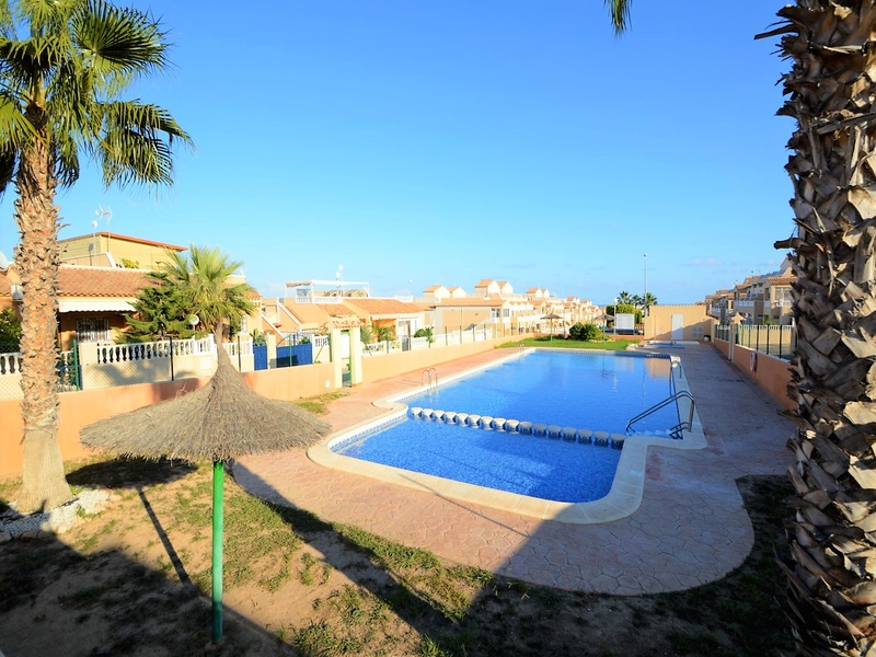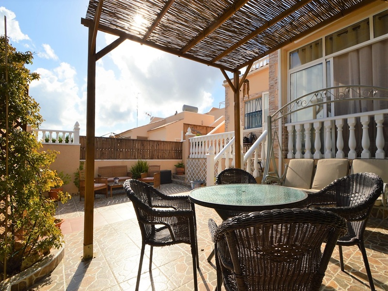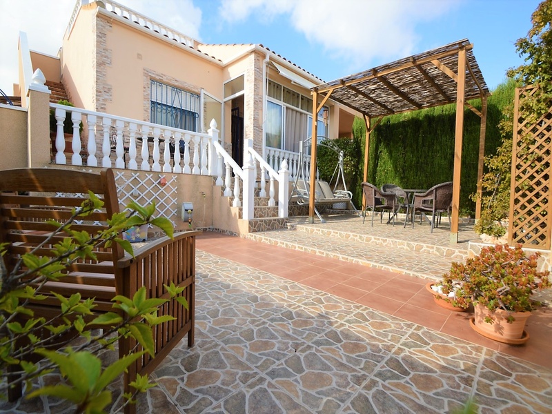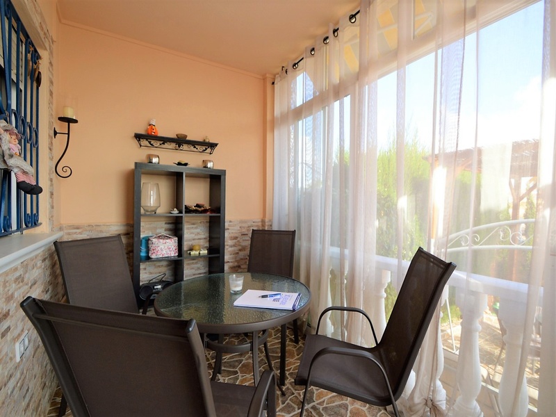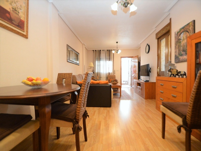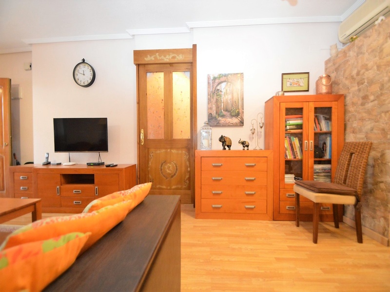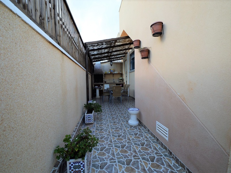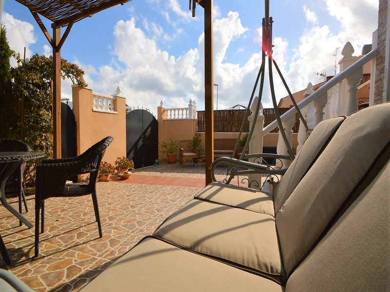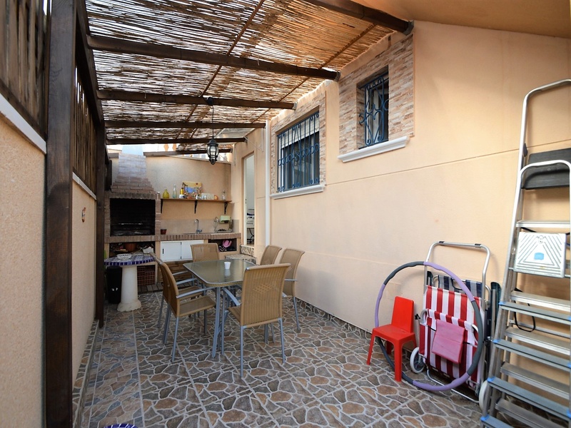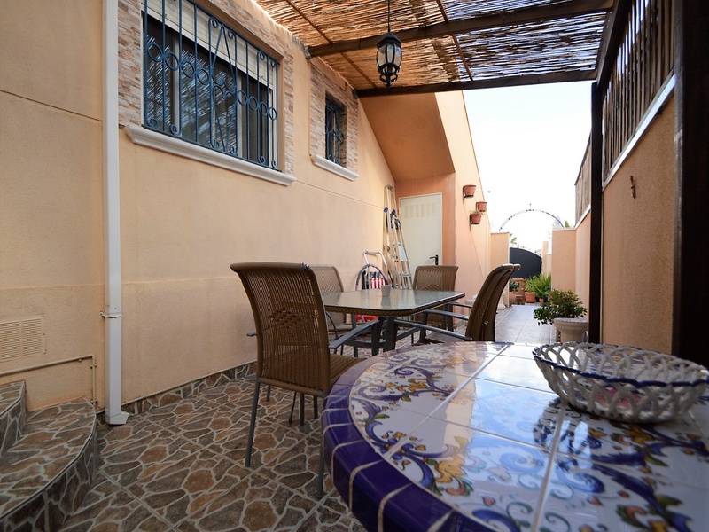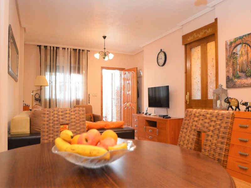 Semi-detached corner house for sale in Torrevieja, in the urbanization of Senuela, on the edge of Orihuela Costa. The house has 70 square meters of a living area distributed between the living room with an open kitchen, a laundry room, two bedrooms and one bathroom – all on one floor. Neoclassical interior design, comfort and cosiness in every detail. Impeccable condition, constructed in 2007, totally repaired in 2016. Fully furnished and equipped with household appliances. The house also has a storage room on the house plot and the possibility of opening a large basement room. Quality construction and finishing materials: laminate flooring in both bedrooms and a living room, air conditioning,, central heating, protective grilles, an armoured door, a shower cabin, single-lever valves, etc. The house has a large solarium with an area of 65 square meters overlooking the sea and a plot of 180 square meters, with an entrance for one car, a barbecue with a dining area and several seating areas. Urbanization has a common swimming pool. Location in a quiet residential area, close to all amenities and services. Schools, supermarkets, bus stops, several shopping centres with shops, pharmacies, banks, restaurants, cafes, etc. are within a walking distance from the house. The magnificent beach of Punta Prima and the best beaches of Torrevieja and Orihuela Costa are in a 5-minute driving distance.
