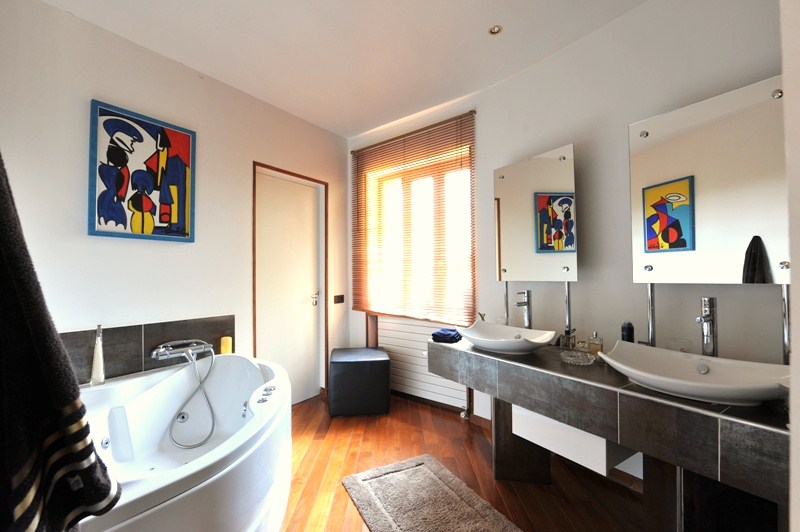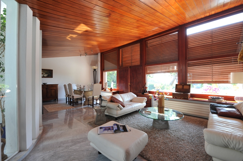 On the hills, in about 10 km from Nice center, ina green and cal area, villa of inspiration "Le Corbusier", on a land of 4000 m² with trees garden. Private pool (12m x 6m, depht: 80-220 cm), shower. Large terraceswith fornitures and sun loungers. Pool house. Alarm. Parking. Shops, sea and beach (stones) 5 km.