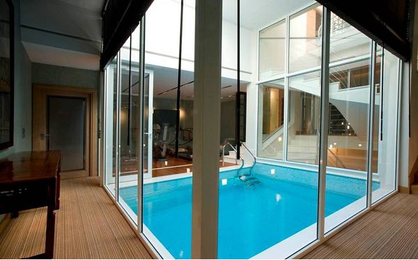 На следующем уровне расположена комната-сейф, зона СПА, сауна, хамам, огромный душ, спортивный зал и подогреваемый бассейн с открывающейся стеклянной крышей.
