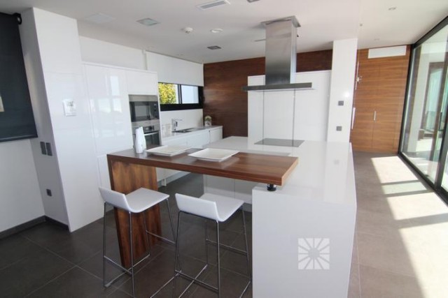 Строительство новой ультрасовременной виллы в эксклюзивном резиденциальном комплексе Jazmines, в районе Кумбре дельСоль, между Хавеа и Кальпе, в 5 минутах от Коммерческого Центра, 2 км до пляжа. Современный проект, приватный и безопасный, предназначен для удовлетворения самых взыскательных и требовательных. Недвижимость состоит из двух уровней: на нижнем этаже находится гараж, приблизительно 80 кв.м., вместимостью на 3-4 автомобиля, огромная кухня, по дизайн-проекту с эффектным островом в центре, которая сообщается со столовой, верандой и зоной барбекю, здесь же находятся кладовая, прачечная и туалетная комната. Несомненно, основное внимание притягивает салон-гостиная, где впечатляет шестиметровая высота потолков и стеклянные стены, которые позволяют наслаждаться солнечным светом и восхитительными видами на море. Отличительной деталью верхнего этажа является Главная спальная с приватной террасой 41 кв.м., которая впечатляет своими размерами, около 34 кв.м., и состоит из зоны отдыха, гардеробной и ванной комнаты, где есть джакузи и душевая кабина. на этом же этаже располагаются ещё три спальни, каждая из них имеет встроенный шкаф и ванную комнату en suite. Зону отдыха верхнего этажа завершает просторный салон-кинотеатр. Дополняет эту виллу ландшафтный сад, спроектированный из различных элементов: веранда, чтобы наслаждаться морским бризом, зона барбекю для пикников на открытом воздухе, огромная терраса, чтобы загорать, и великолепный бассейн “инфинити”, который сливается с бесконечностью Средиземного моря. На стадии строительства, возведены стены, сдача объекта летом 2013 года. Дом построен на участке 1.045 кв.м имеет общую площадь 587,55 кв.м. с полезной площадью 276, 55 кв.м Верандa 34.30 m2 Наружная терраса 117,70 m2 Гараж c пандусом и aвтомат-ворота 159 m2 Пергола 34,30 m2 2 холла Полностью мебелированная кухня Столовая 4 спальни 5 С/Узлов Бассейн-Инфинити с подсветкой, поверхность воды 65,60 кв.м. Стены по периметру из натурального камня Солнечные панели Аудиосистема Динамики интегрированные в потолках установлены в кухне, спальнях и ванной комнате, от B & W или аналогичной марки, проигрывание multi-room аудиосистемы с помощью дистанционного управления. Кинотеатр Предварительная установка для кинотеатра в гостиной, в соответствии с планом. Мультирум аудиосистема SONOS или аналогичной марки, с использованием различных аудио источников, подключенных к сети Ethernet: компьютеры, плееры, мультимедийные жесткие диски, интернет-радио, интернет услуги и т.д. Солнечные коллекторы Солнечные панели для производства горячей воды в соответствии с действующими нормами. Вентиляция Система вентиляции жилья с помощью установки решетки воздухозаборника Видеонаблюдение Система видеозаписи интегрирована в системы домашней автоматизации, состоящая из 4 внешних камер, просмотр записей с любого компьютера, подключенного к сети дома. Кондиционирование Термостаты для индивидуального регулирования температуры в каждой комнате, интегрированы в системе Умный Дом. Контроль Главная Система автоматизации контролируется с помощью электрических переключателей и domotic колодки, 12" цветной сенсорный экран, установленный на стене, пульт дистанционного управления с сенсорным экраном, с любого компьютера, подключенного к сети, из Интернета и с мобильных телефонов, если они настроены. Общие Г