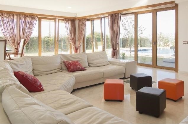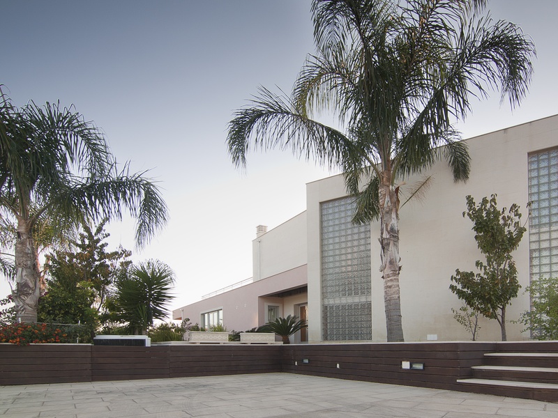 Behind the house are located saltwater pool surrounded by gardens and lawns, and a wooden deck.