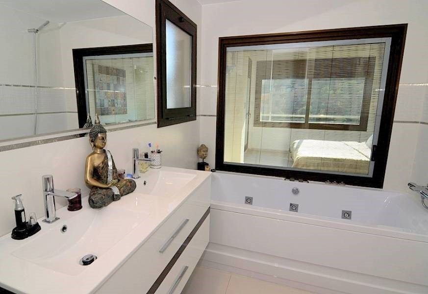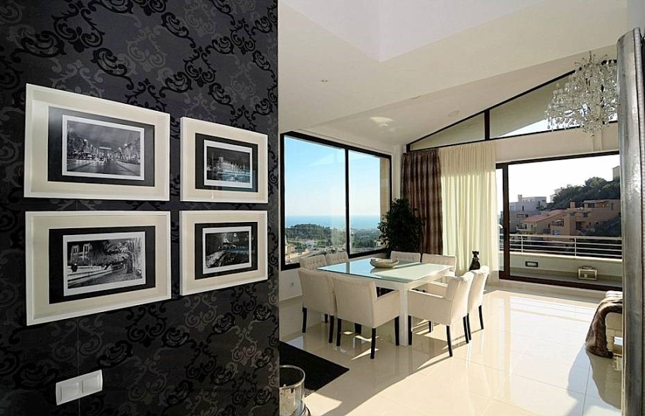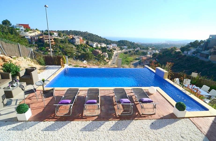 В жилом районе Квинт Мар в близости от центра города и пляжей Ситжес, этот дом современного дизайна , яркий и просторный. Из любого места в доме имеет прекрасный вид на море. Состоит из большой гостиной с выходом на террасу, кухня очень современный дизайн, три спальни с ванными комнатами, кабинет и  обустроенная мансарда. В саду есть бассейн, терраса с непревзойденным  видом на море.