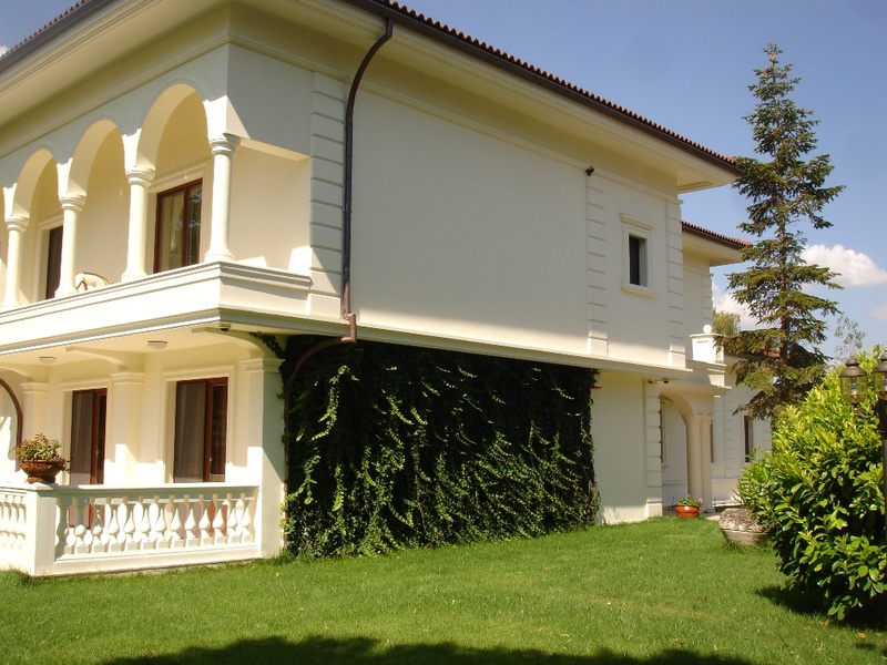 Имущество полностью огорожено сеткой и живым зелёным забором из кустарника. Перед домом имеется круговая дорожка с фонтаном посередине.