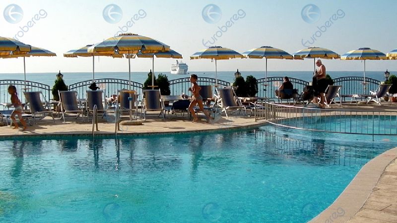 • огромная терраса с плавательным бассейном, зонтами и шезлонгами, с пальмами и кипарисами;