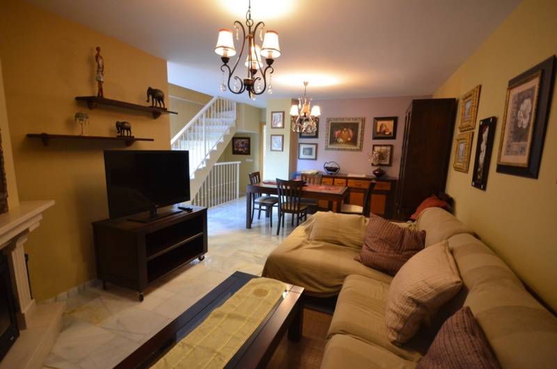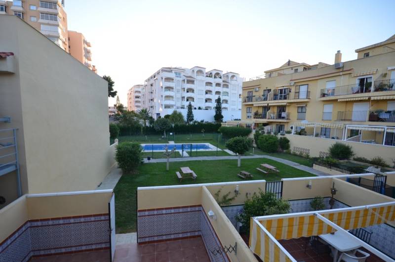 This is an amazing townhouse in just a 7-minute walk from the beach and just a 10-minute walk to the famous Puerto Marina. It has 3 big-sized bedrooms, 2 bathrooms, a grand fully equipped kitchen and several terraces. There are fitted wardrobes, a fireplace, an A/C and a garden with a swimming pool that belongs to the community. There is also a parking space and the storage room included into the price.