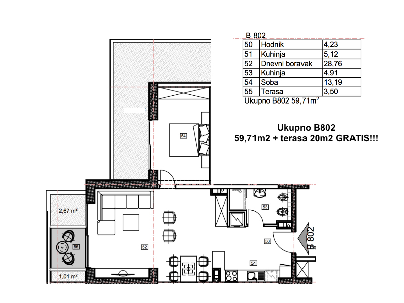 One bedroom B802 flat with Mediteransku street view
