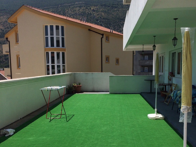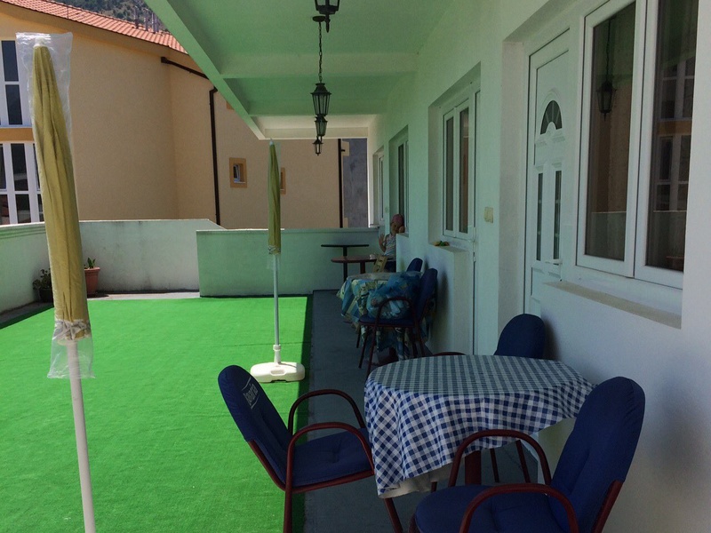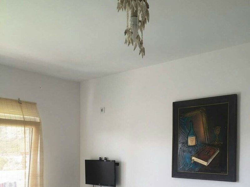 Выходит на большую террасу с ковром ( 85м), изумительным видом на окружающие горы и море, до которого можно доехать на машине за пару минут (800 м).