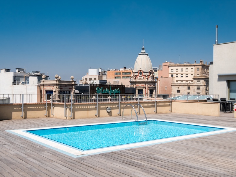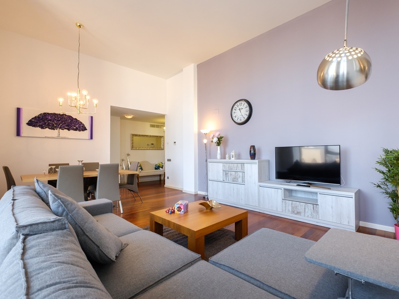 This luxurious and spacious apartment of 100 m2 is ideal for families. POSSIBLE RENTAL ON OTHER CONDITIONS The apartment has a large bedroom with a double bed, 2 bedrooms with 2 separate beds in each and a spacious living room with a dining area and a small corner with a desk. The whole apartment is fully equipped, including air conditioning, heating, TV, washing machine, Wi-Fi Internet. In addition, the building has a concierge and a terrace with a swimming pool and a gym on the roof where you can enjoy a panoramic view of Barcelona.