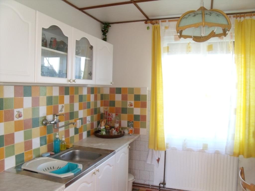 This two-storey brick family house is located in the center of Bakonyszentlászló is for sale.On a 500 sqm plot, this practical house has four rooms. Two on the ground floor with a big living room, kitchen and bathroom and two half-rooms in the attic with a cozy patio.