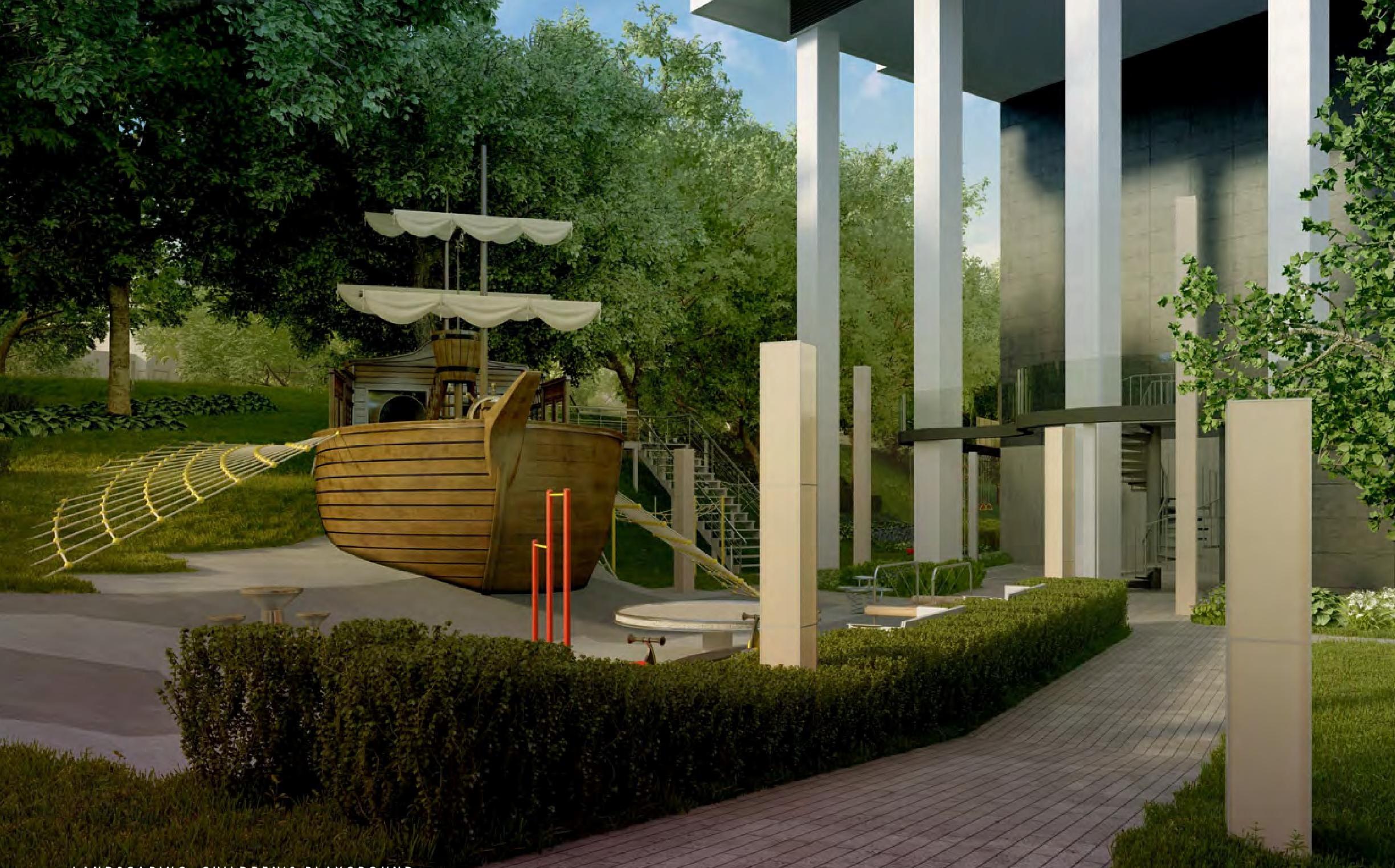A unique feature of the project's architecture is the position of first apartment floor - it is placed 14 meters above the ground. This solution allows to effectively increase the recreational area. There are squash, basketball and volleyball courts as well as 2 children's playgrounds. In the 12-meter-high hall there is a library.