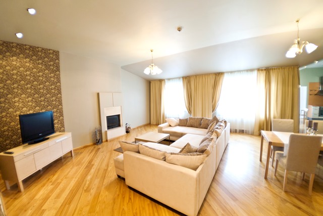 Уютная квартира с камином. При отделке помещений использованы натуральные и качественные материалы. Квартира полностью меблирована, оборудована системой встроенных шкафов, комплектом качественной бытовой техники и современной встроенной кухней. На полу - паркетная доска, окна декорированы гардинами.