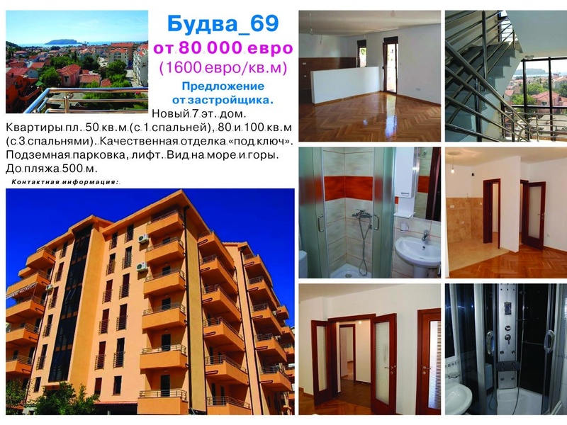 Будва. Предложение от застройщика. Новый 7 эт. дом. Квартиры пл. 50 кв.м (с 1спальней), 80 и 100 кв.м (с 3 спальнями). Качественная отделка "под ключ". Подземная парковка, лифт. Вид на море и горы. До пляжа 500 м....