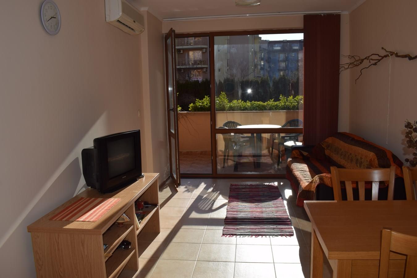 One bedroom apartment on ground floor overlooking the courtyard with a swimming pool, flowers and hedges. It consists of an entrance hall, a terrace, a bathroom with a toilet, one bedroom and a living room with a kitchenette. Area: 63.11 sq.m.
